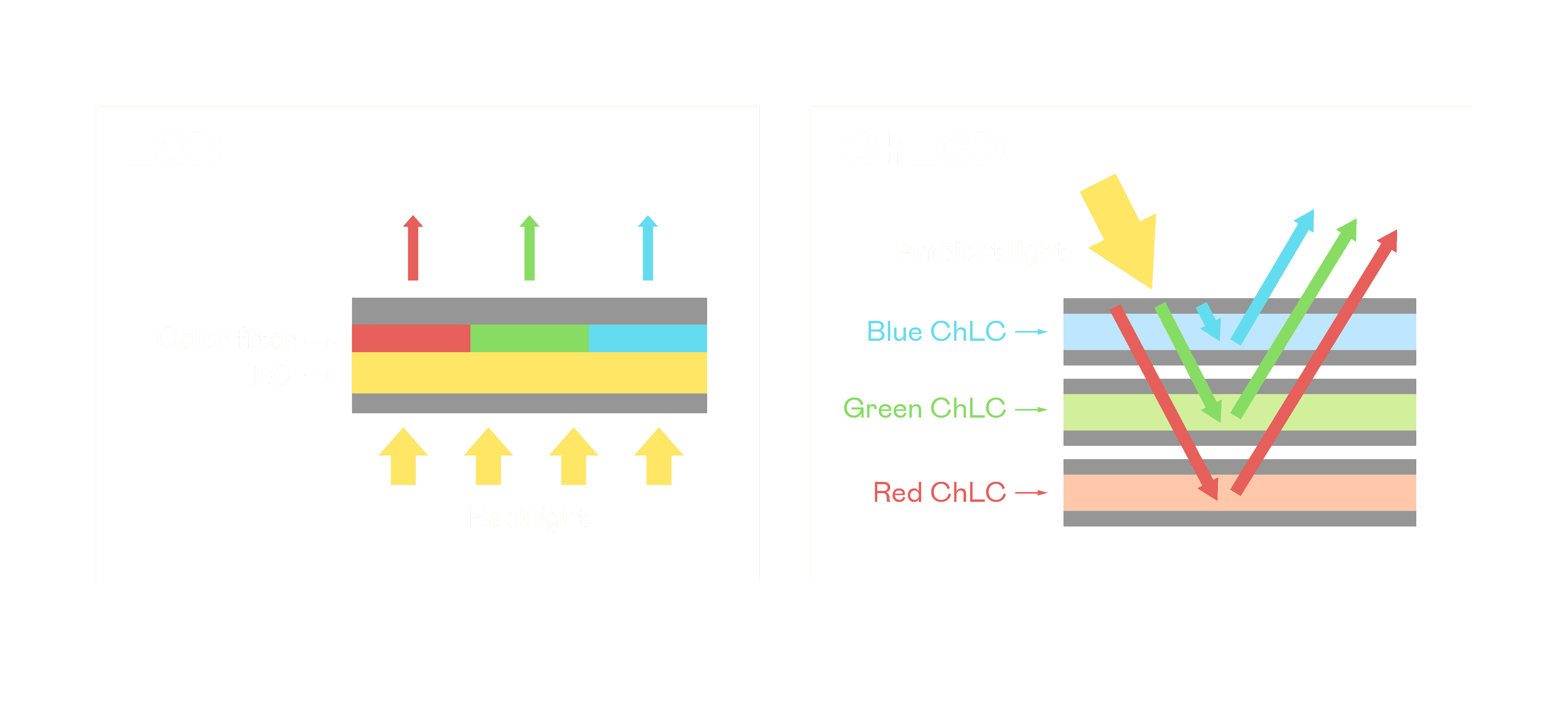 ChLCD 胆固醇液晶就如同纸张一样,,,,透过反射环境光来显示影像,,,,因此长时间观看不易造成人眼视觉疲劳,,,可达到护眼效果。。。当处于户外阳光下使用,,LCD 影像容易失真而不易观看,,,但胆固醇液晶仍可维持较佳的影像品质。。